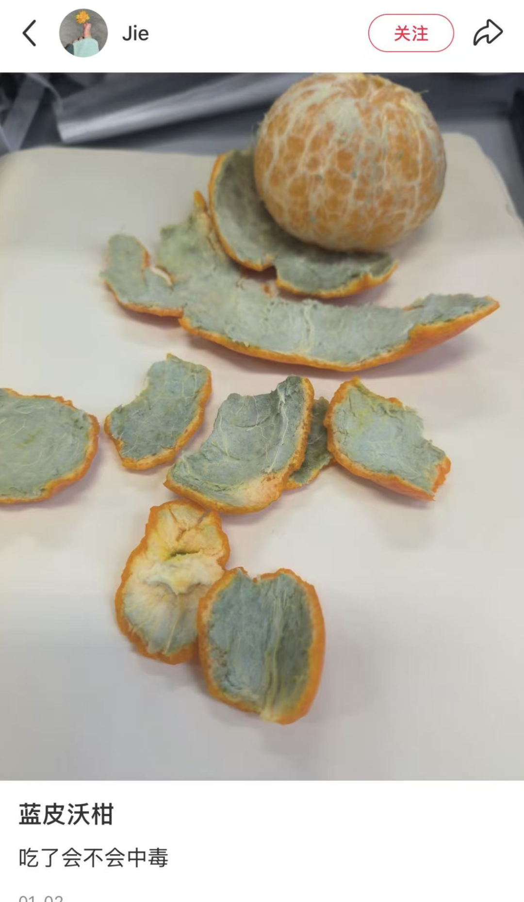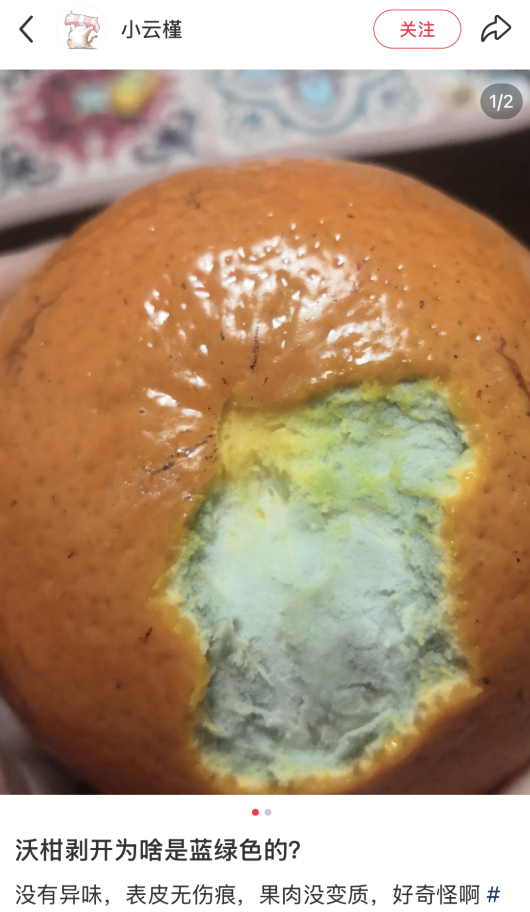 除了銅離子氧化,沃柑果皮內(nei) 側(ce) 變藍也可能是由於(yu) 細菌或(真菌中的)黴菌感染。在高溫高濕的環境中,真菌孢子很容易侵入沃柑內(nei) 部,導致其變質並產(chan) 生黴變。如果沃柑內(nei) 部的藍色是由於(yu) 黴菌感染引起的,通常會(hui) 伴隨其他變質跡象,比如異味、果肉發軟或表麵出現黴斑。