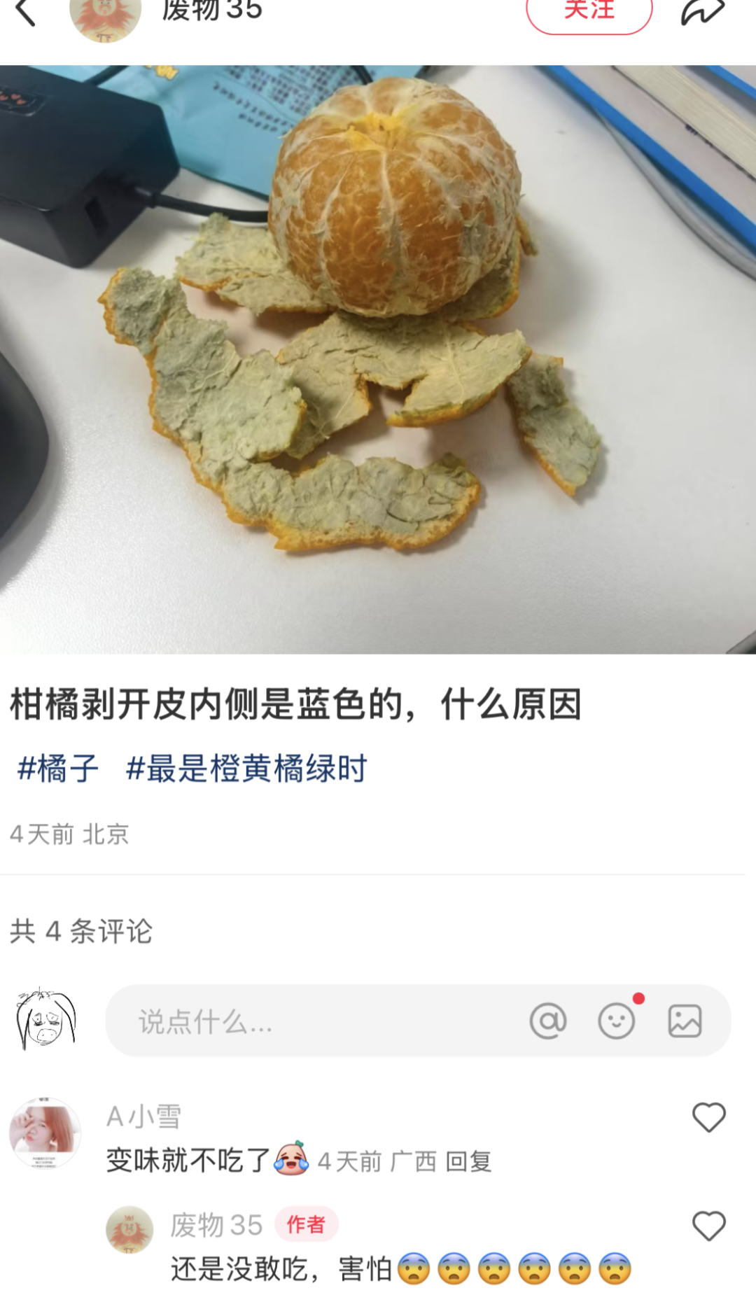 在種植過程中,果農(nong) 為(wei) 了防治病蟲害,會(hui) 使用一些含銅的農(nong) 藥,比如波爾多液。這種農(nong) 藥雖然能保護枝葉,但多的銅離子可能會(hui) 滲透到果皮內(nei) 側(ce) 。當果皮被剝開後,銅離子與(yu) 空氣接觸,就會(hui) 發生氧化反應,變成藍色。這種藍色看起來雖然有點嚇人,但並不會(hui) 對果肉造成汙染。