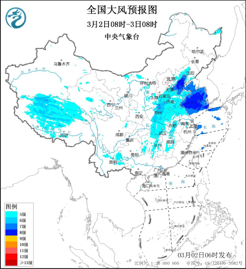 預計,3月2日08時至3日08時,華北南部、黃淮、江淮北部和西部、江漢以及雲(yun) 南東(dong) 部、西藏中北部、青海南部、新疆南部等地有4~6級風,陣風7~8級;渤海、渤海海峽、黃海大部海域將有7~8級、陣風9級的大風。