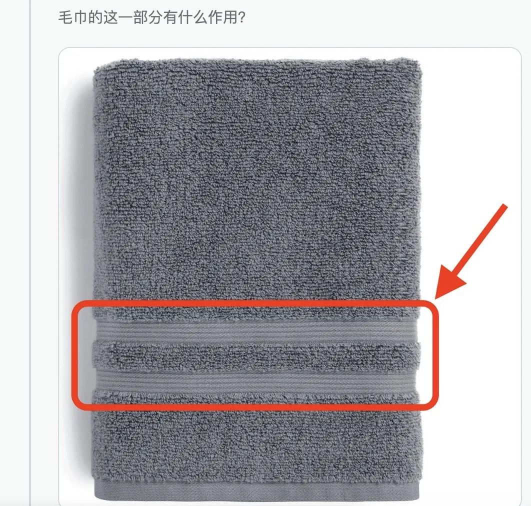 很快,眾(zhong) 多網友加入了討論,有人說“這是一條分界線,上麵擦臉,下麵擦屁股”。還有人說“這些條紋可以讓濕毛巾加速變幹”。