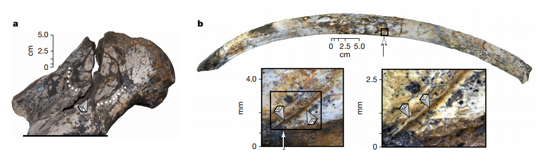 在俄羅斯北冰洋的科特爾尼島,科學家發現了一具猛獁象骨骼,根據這具骨骼上的人為(wei) 切割痕跡和殘留的矛頭,可以推測古人類獵殺並食用猛獁象的場景。在新墨西哥州,考古學家在猛獁象和其幼崽的骨骼上發現了由鈍器造成的骨折和刺孔,同樣呈現出明顯的被屠宰痕跡。種種跡象表明,古人類獵食猛獁象確有其事。