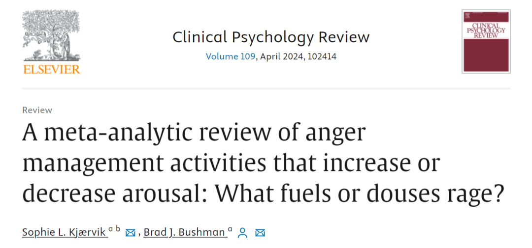 [1]Kjærvik, Sophie Lyngesen, and Brad J. Bushman. "A meta-analytic review of anger management activities that increase or decrease arousal: What fuels or douses rage?." Clinical Psychology Review (2024): 102414.