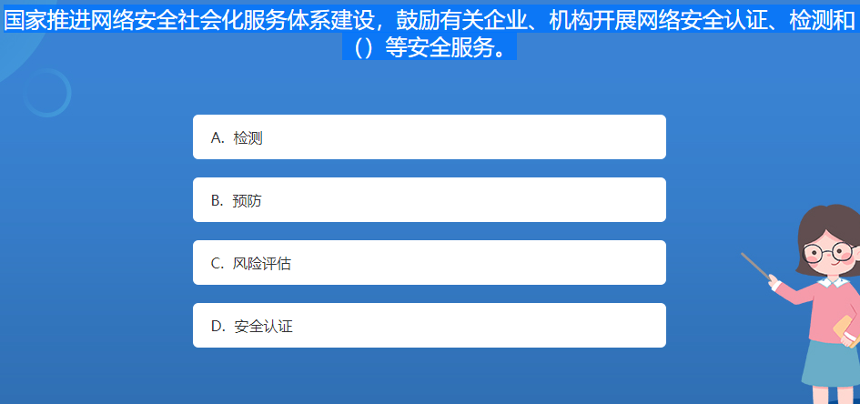 科普星空体育官网入口网站問答:國家推進網絡安全社會化服務體係建設,鼓勵有關企業、機構開展網絡安全認證、檢測和()等安全服務。
