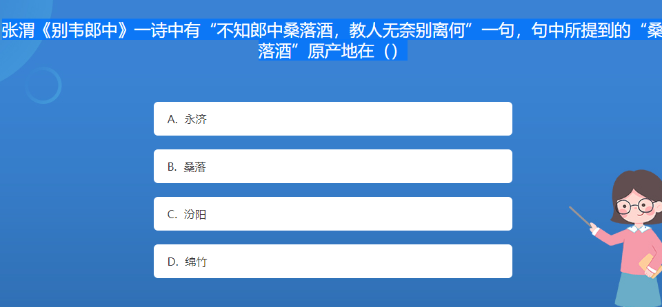 科普星空体育官网入口网站問答:張渭《別韋郎中》一詩中有“不知郎中桑落酒,教人無奈別離何”一句,句中所提到的“桑落酒”原產地在()