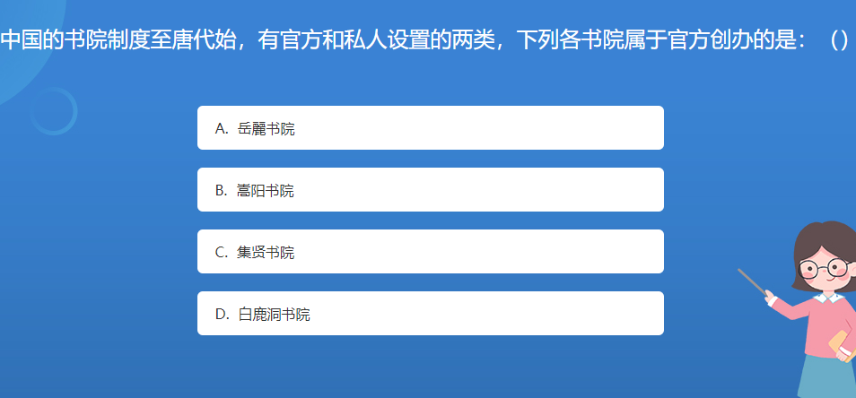 科普星空体育官网入口网站問答:中國的書院製度至唐代始,有官方和私人設置的兩類,下列各書院屬於官方創辦的是:
