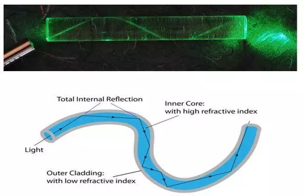 人們驚奇地發現,正常情況下光沿著直線傳遞,可是光也可以沿著彎曲水流的方向傳遞。如果這個水流足夠長,光就能夠沿著彎曲的方向傳遞很遠。當然,如果將水流換成細細的玻璃圓柱體,這樣光也可以在這個細細長長的圓柱體裏無數次全反射,從而進行遠距離傳輸,這樣就形成了光纖。