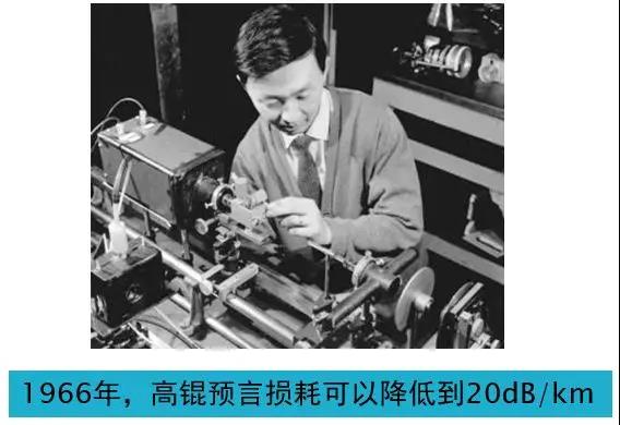 1966年高錕(Charles K. Kao)和他的導師 George Hockham共同發表一篇光纖通信史上最為重要的論文《光頻率介質纖維表麵波導》,通過分析和實驗指出,玻璃的損耗主要來源於雜質的吸收,如果將玻璃中的雜質濃度降低到1ppm(百萬分之一)就可以將光纖的損耗降低到20dB/km。但是,高錕的這個預言當時並沒有受到重視,當時幾乎沒人相信玻璃的損耗可以做到如此之低。