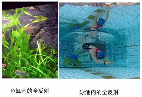 如果我們留心觀察,在現實生活中也可以觀察到全反射現象。比如從魚缸下麵或者從遊泳池下麵向上看,可以看到水麵有清晰的倒影。以及音樂噴泉中燈光沿著水柱向任意方向傳輸。