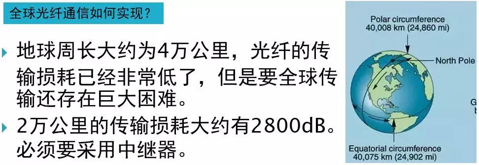 隨著製造工藝的不斷發展,光纖損耗不斷降低,最小損耗低至0.14dB/km。地球周長大約為4萬公裏,光纖的傳輸損耗已經非常低了,但是要全球傳輸還存在巨大困難。2萬公裏的傳輸損耗大約有2800dB,因此,必須要采用基於摻鉺光纖放大器的中繼器。