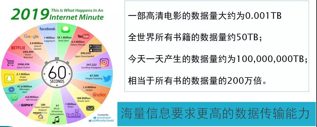 一部電影的數據量大約為0.001TB;全世界所有書籍的數據量約50TB;今天一天產生的數據量約為100,000,000TB;相當於所有書的數據量的200萬倍。現在單根光纖的通信速率已經達到1000TB /s以上,可以實現一根光纖上近300億人同時通話。全世界所有書籍的數據量一根光纖0.02秒就可以傳完。全球產生的數據量利用多芯光纜也可以幾小時內傳輸完成。