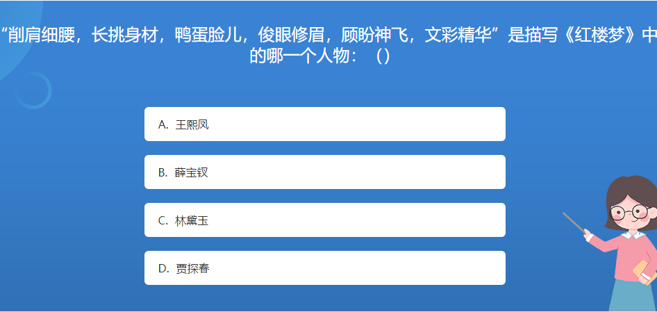 科普星空体育官网入口网站問答:“削肩細腰,長挑身材,鴨蛋臉兒,俊眼修眉,顧盼神飛,文彩精華”是描寫《紅樓夢》中的哪一個人物:()