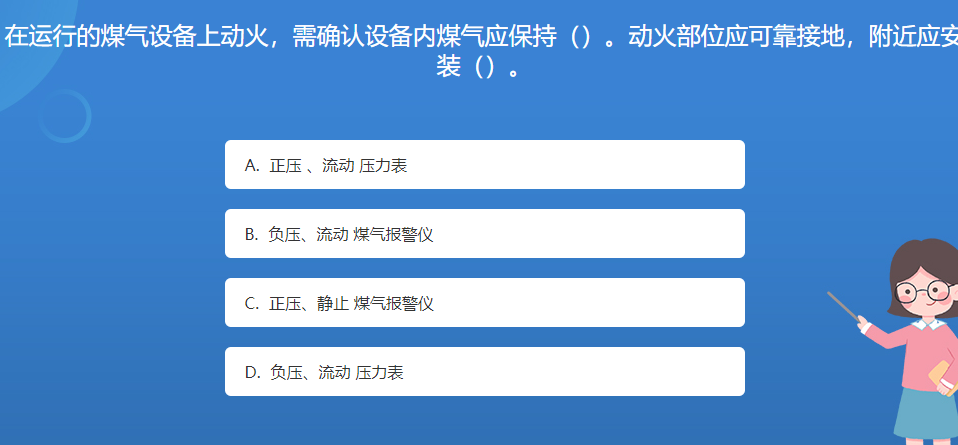 科普星空体育官网入口网站問答:在運行的煤氣設備上動火,需確認設備內煤氣應保持()。動火部位應可靠接地,附近應安裝()。