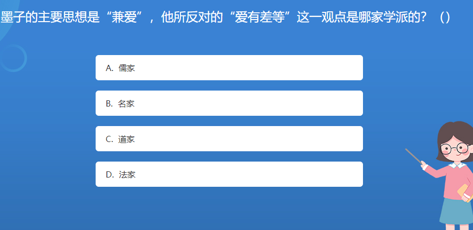 科普星空体育官网入口网站問答:墨子的主要思想是“兼愛”,他所反對的“愛有差等”這一觀點是哪家學派的?()