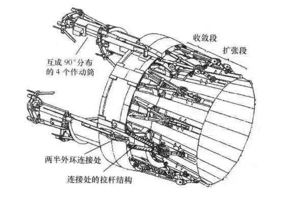 (2)內推力矢量:通過發動機尾噴管自身結構的偏轉來實現尾噴管方向的改變,又稱為推力矢量噴管(圖2)。