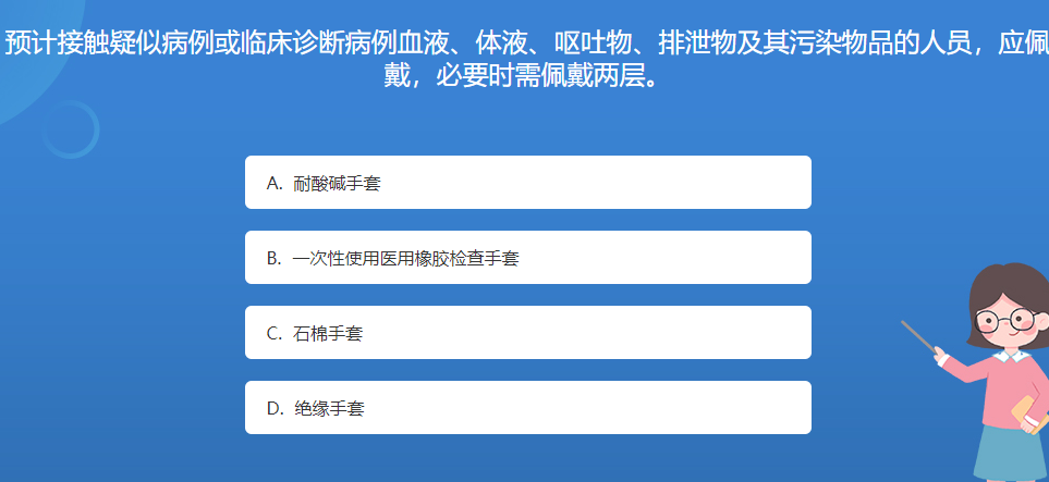 科普星空体育官网入口网站問答:預計接觸疑似病例或臨床診斷病例血液、體液、嘔吐物、排泄物及其汙染物品的人員,應佩戴,必要時需佩戴兩層。