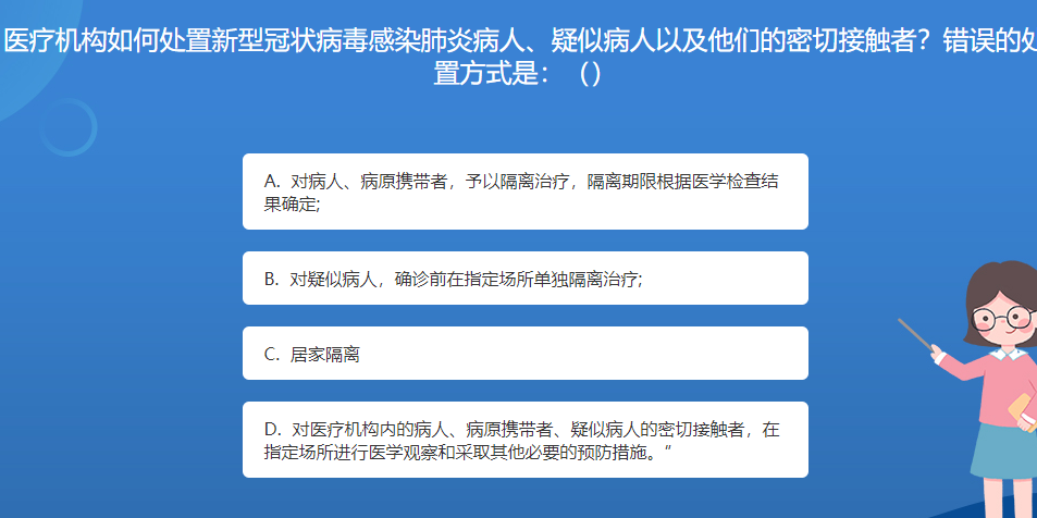 科普星空体育官网入口网站問答:醫療機構如何處置新型冠狀病毒感染肺炎病人、疑似病人以及他們的密切接觸者?錯誤的處置方式是:()