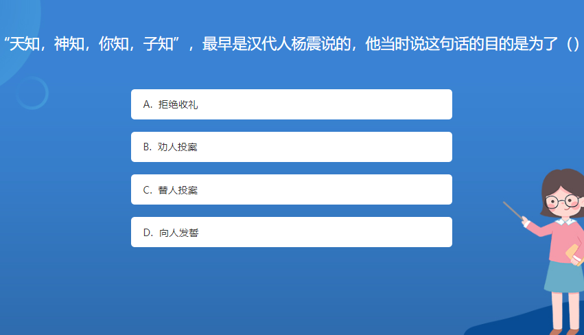 科普星空体育官网入口网站問答:“天知,神知,你知,子知”,最早是漢代人楊震說的,他當時說這句話的目的是為了()