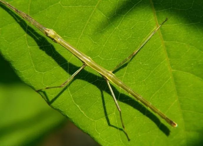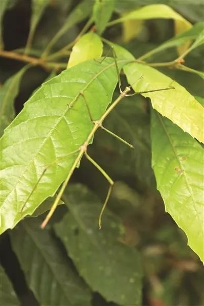 在我國海南和雲南的熱帶雨林中生活著一種奇特的昆蟲,如果它靜止不動,與周圍的樹葉混合在一起,人們很難看出它是一隻昆蟲。這種昆蟲就是竹節蟲。竹節蟲的腹部和背上的翅膀極像雨林中一片寬大的綠色闊葉片,中間有凸起的葉片中脈,兩邊有較細的葉片支脈,圓圓的小頭正好做葉柄。它的體色與棲息生活環境中的植物葉片顏色一致,多為綠色或褐色。這種擁有體形與體色雙重偽裝能力的昆蟲,堪稱大自然最傑出的偽裝擬態大師。