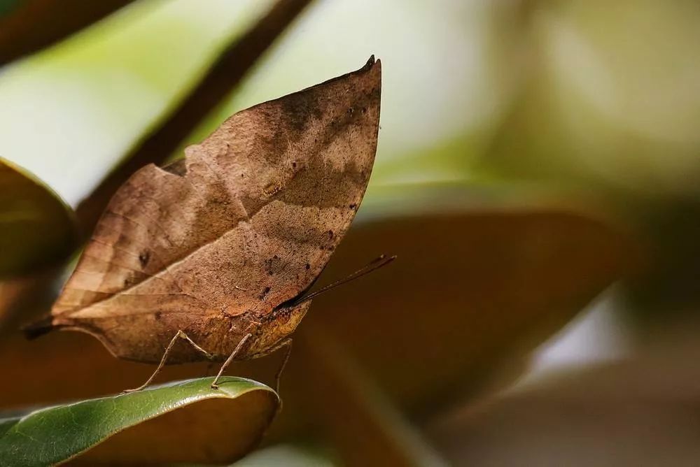 “似葉非葉枯葉蝶,時現時隱飛或歇;後翅尾突如葉柄,並翅藏頭酷似葉。色似枯葉紋似脈,巧奪天工堪稱絕;翅表閃藍橙黃帶,突然展翅驚飛雀。”這首詩可謂是將枯葉蝶的形態特征描述的淋漓盡致。當我們被枯葉蝶的以假亂真的騙術所迷惑,我們不禁讚歎大自然的傑作。上帝是如何巧妙地創造了萬物啊!可是,枯葉蝶不是上帝創造的,而是它們自己長期適應自然的結果。可與此同時,枯葉蝶也是昆蟲界的忍者,明明有著最令人嫉妒的絕美,卻用另一麵的枯槁來隱匿,它將自己的美麗偽裝起來,作為弱者,別無他法,大自然的處世哲理是不可捉摸的。