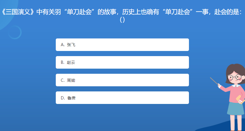 科普星空体育官网入口网站問答:《三國演義》中有關羽“單刀赴會”的故事,曆史上也確有“單刀赴會”一事,赴會的是:()