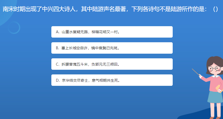 科普星空体育官网入口网站問答:南宋時期出現了中興四大詩人,其中陸遊聲名最著,下列各詩句不是陸遊所作的是:()