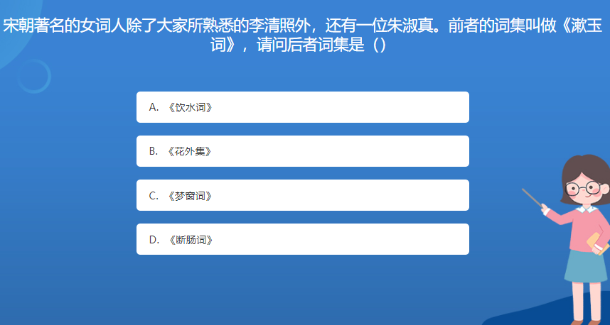 科普星空体育官网入口网站問答:宋朝著名的女詞人除了大家所熟悉的李清照外,還有一位朱淑真。前者的詞集叫做《漱玉詞》,請問後者詞集是()