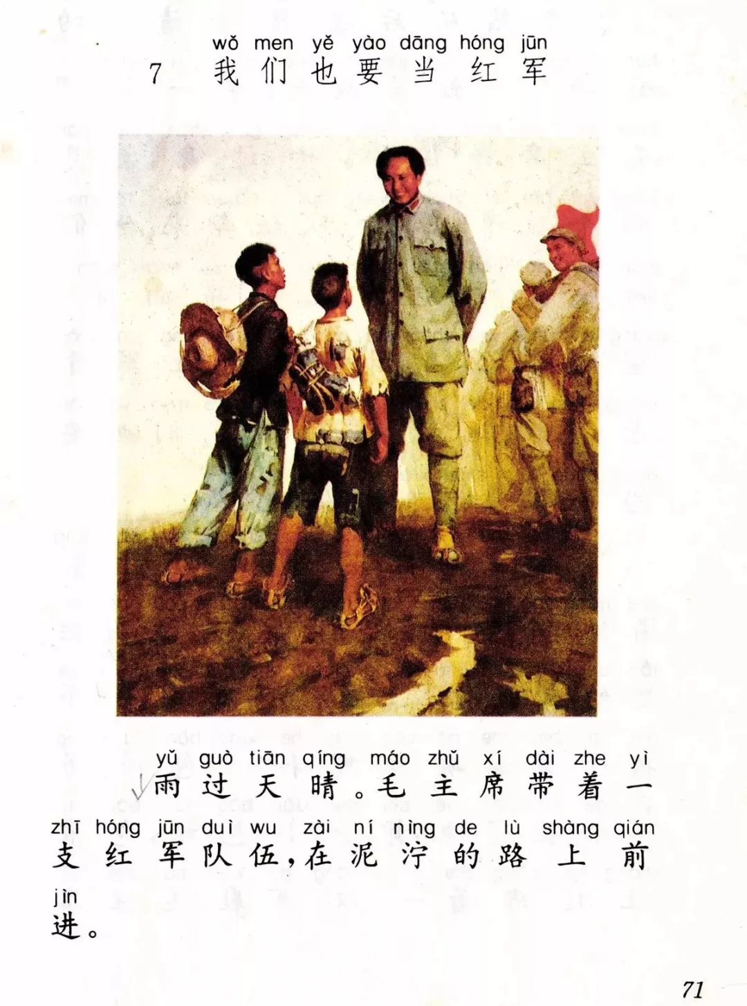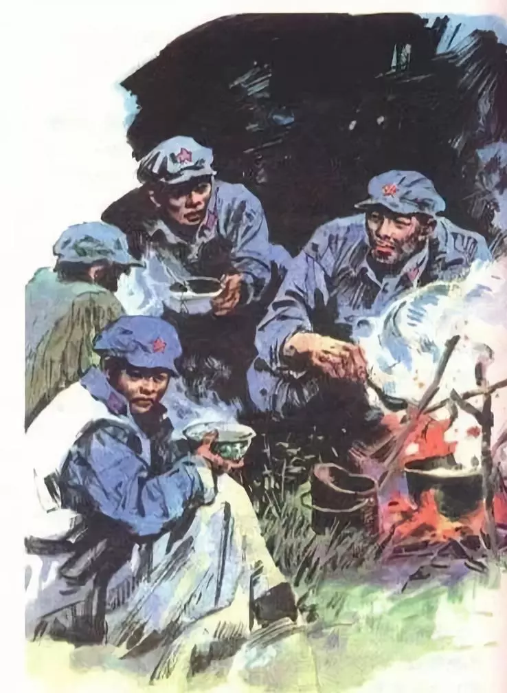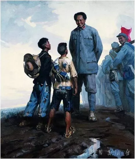 課文《我們(men) 也要當紅軍(jun) 》,描寫(xie) 的是在荒野茫茫的崎嶇山路上,兩(liang) 個(ge) 曆盡辛苦、長途跋涉的貧苦少年,終於(yu) 趕上紅軍(jun) 隊伍並要求參軍(jun) ,而毛主席微笑著答應他們(men) 參軍(jun) 的場景。課本裏有一篇配圖,這幅畫原名《貧農(nong) 的兒(er) 子》,作者是我國老一代著名畫家蔡亮。