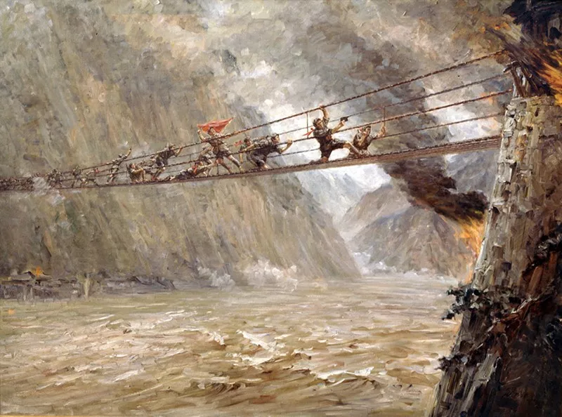 除了這幅畫之外,還有另外一幅比較知名的《飛奪瀘定橋》。這幅畫誕生時間更早,由中國第二代油畫家劉國樞於(yu) 1957年創作,現藏於(yu) 中國人民革命軍(jun) 事博物館。