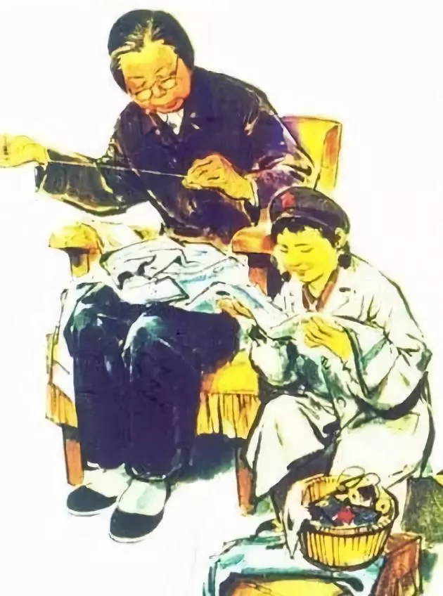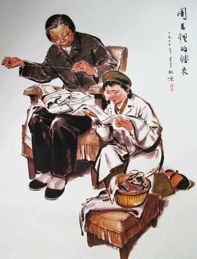 這幅國畫描繪的是七十多歲的鄧媽媽戴著老花鏡給周總理補睡衣,旁邊的小護士捧著睡衣望著補丁上又勻又密的針腳濕潤了眼睛。