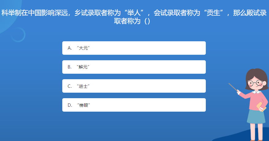 科普星空体育官网入口网站問答:科舉製在中國影響深遠,鄉試錄取者稱為“舉人”,會試錄取者稱為“貢生”,那麽殿試錄取者稱為()