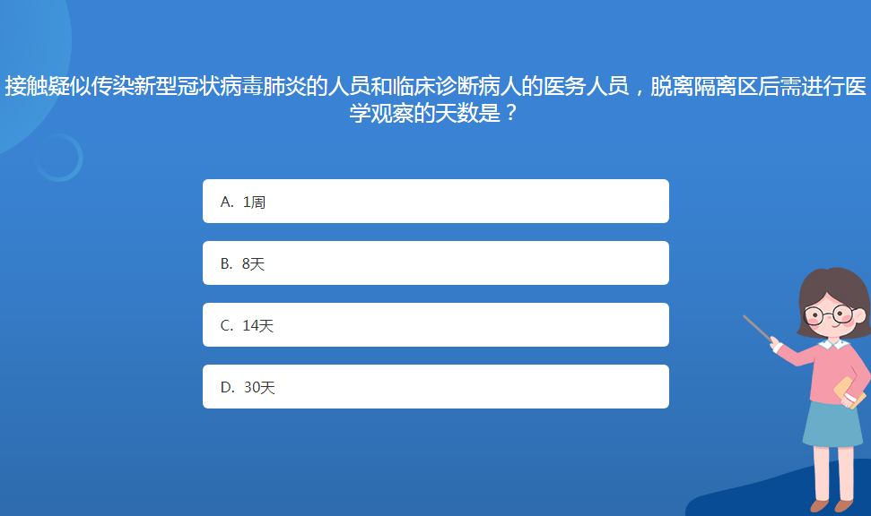 科普星空体育官网入口网站問答:接觸疑似傳染新型冠狀病毒肺炎的人員和臨床診斷病人的醫務人員,脫離隔離區後需進行醫學觀察的天數是?