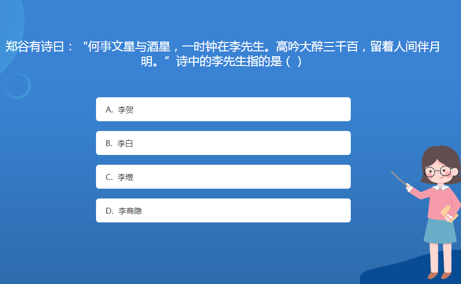 科普星空体育官网入口网站問答:鄭穀有詩曰:“何事文星與酒星,一時鍾在李先生。高吟大醉三千百,留著人間伴月明。”詩中的李先生指的是()