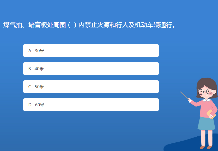 科普星空体育官网入口网站問答:煤氣抽、堵盲板處周圍()內禁止火源和行人及機動車輛通行。