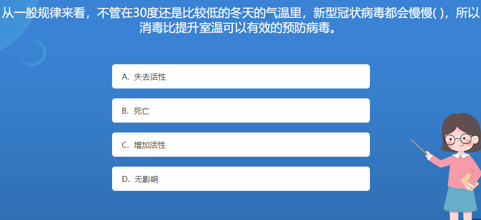 科普星空体育官网入口网站問答:從一般規律來看,不管在30度還是比較低的冬天的氣溫裏,新型冠狀病毒都會慢慢( ),所以消毒比提升室溫可以有效的預防病毒。