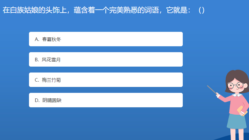 科普星空体育官网入口网站問答:在白族姑娘的頭飾上,蘊含著一個完美熟悉的詞語,它就是:()