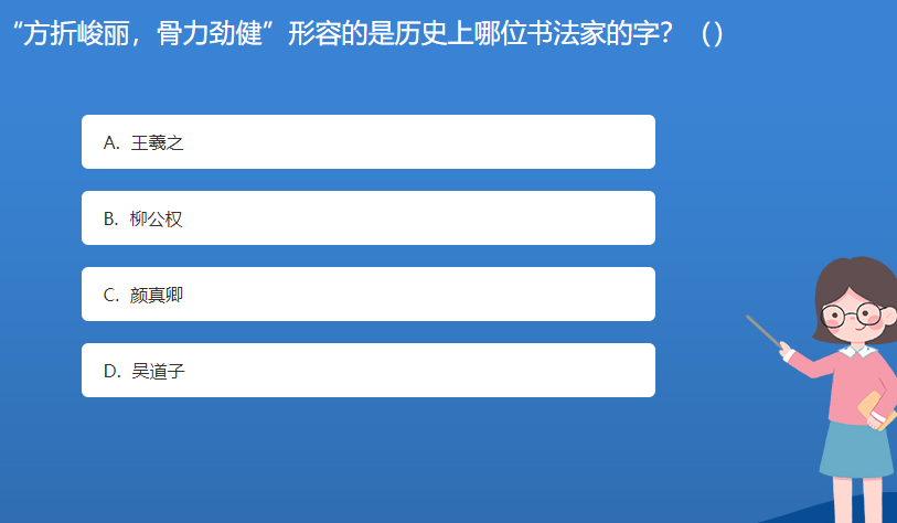 科普星空体育官网入口网站問答:“方折峻麗,骨力勁健”形容的是曆史上哪位書法家的字?()