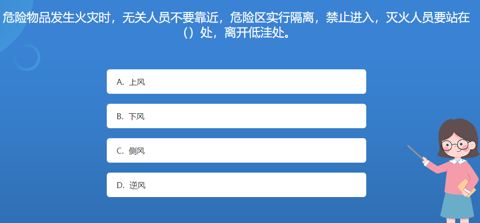 科普星空体育官网入口网站問答:危險物品發生火災時,無關人員不要靠近,危險區實行隔離,禁止進入,滅火人員要站在()處,離開低窪處。