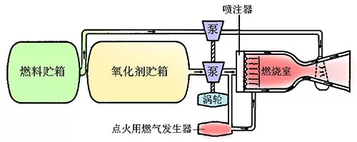 而在液體火箭發動機中,液體推進劑一般是用高壓氣體對燃料與氧化劑貯箱增壓,然後用渦輪泵將燃料與氧化劑進一步增壓並輸送進燃燒室。