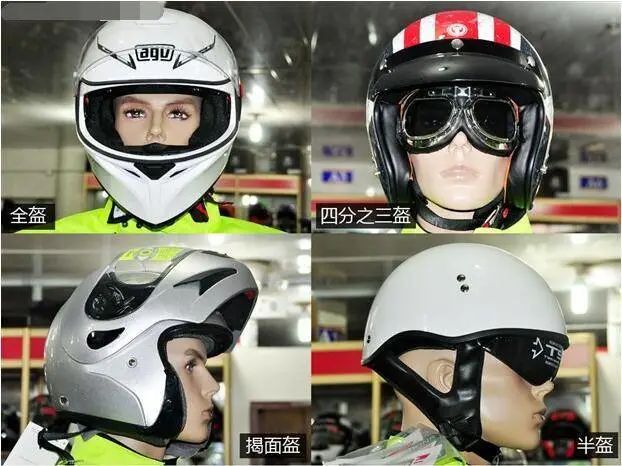 在騎行頭盔中,摩托車頭盔最為(wei) 常見。它又分為(wei) 全盔、3/4盔、半盔和組合盔(揭麵盔)。全盔一般包含護目鏡和下巴處的防護帶,能較好地保護整個(ge) 頭部,但通風性較差,長時間佩戴易產(chan) 生悶氣感。3/4盔和全盔相比下巴處沒有防護。半盔對下巴和後腦都缺乏防護,安全性能較差,但穿戴更便捷,戴上頭盔後更易於(yu) 交流。組合盔(揭麵盔)可以把下巴處裝置翻上去,從(cong) 全盔變為(wei) 3/4盔。幾種類型的摩托車頭盔