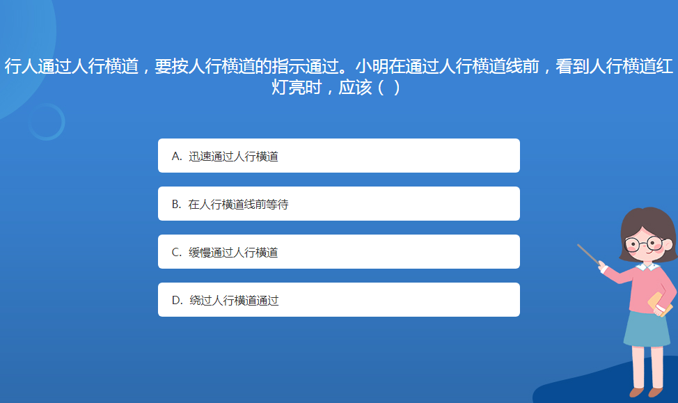 科普星空体育官网入口网站問答:行人通過人行橫道,要按人行橫道的指示通過。小明在通過人行橫道線前,看到人行橫道紅燈亮時,應該()