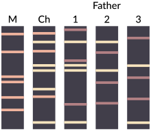 DNA鑒定的簡單示例。M代表母親(qin) ,Ch是孩子,1、2、3是潛在的三個(ge) 父親(qin) 嫌疑人,你能猜到誰最可能是親(qin) 生父親(qin) 嗎?答案是1號。