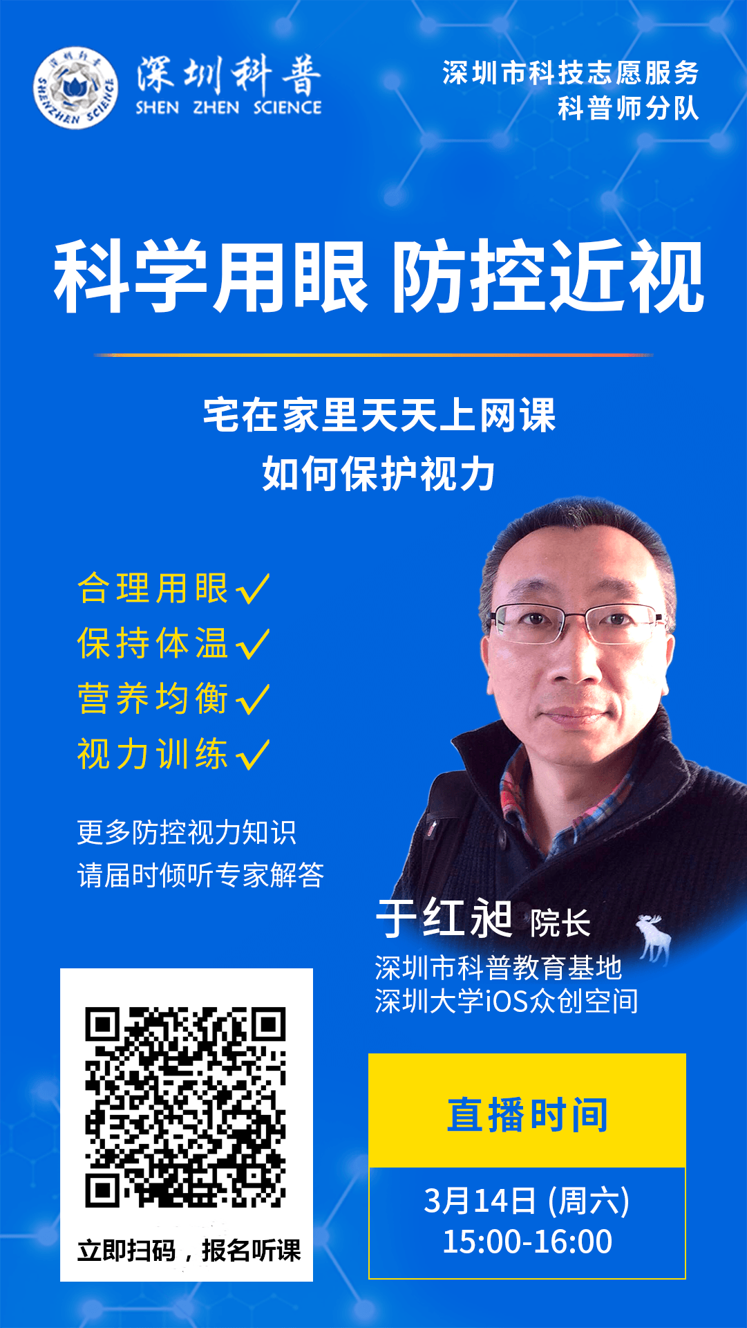 這個(ge) 周末,深圳市科普教育基地聯合會(hui) 的會(hui) 員單位——深圳大學ioses眾(zhong) 創空間於(yu) 紅昶院長,來給大家在線講解如何“科學用眼,防控近視”。從(cong) 2月中旬開始,於(yu) 紅昶院長已經受邀為(wei) 幾十所中小學的網課,做了講座哦~