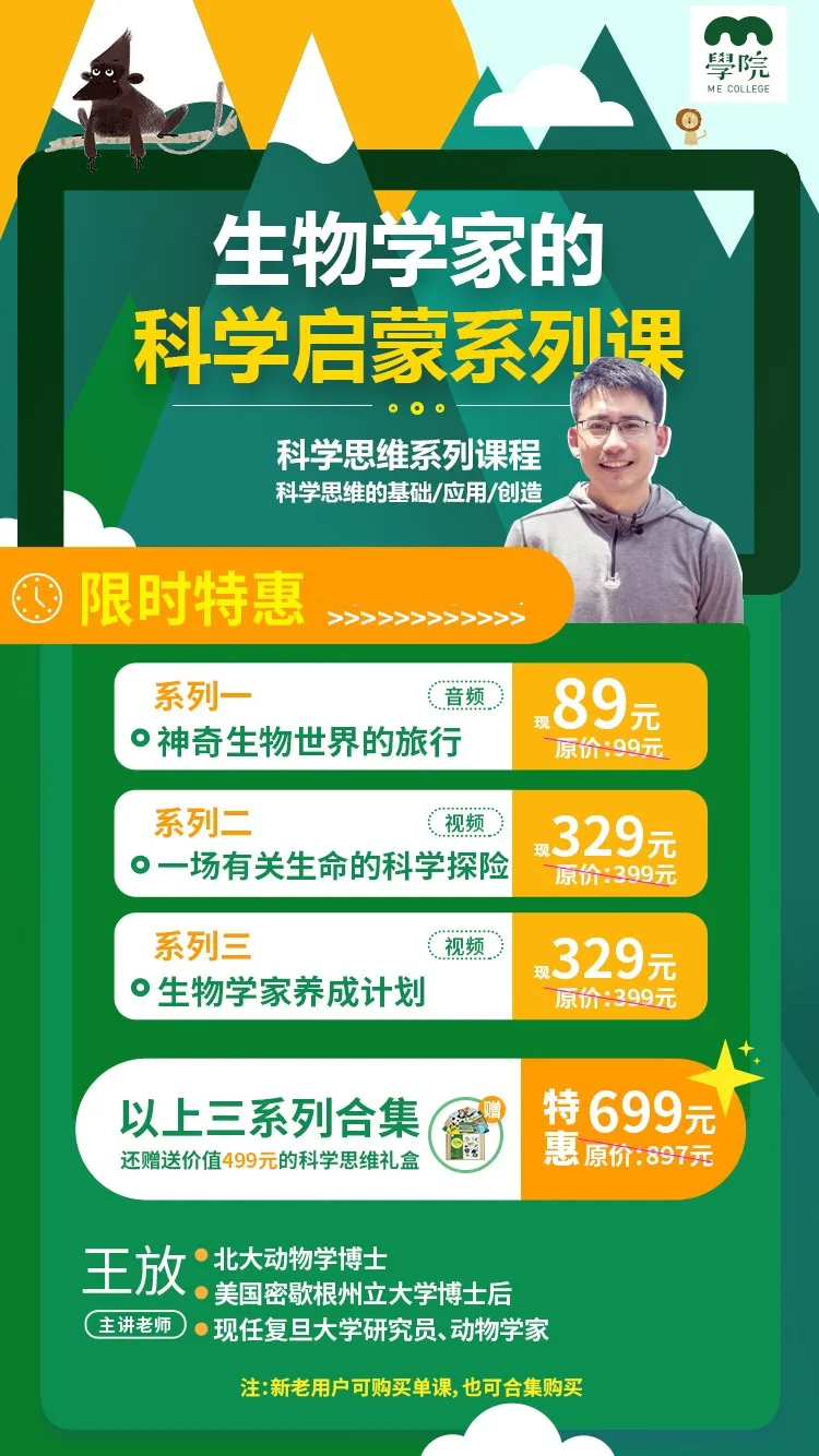 相信很多人都對王放老師非常熟悉了,他在ME學院已經給孩子們開設了數十場直播課,分享了各種各樣的關於野生動物、關於自然探險的故事,更重要的是傳遞了觀察世界的科學方法和科學態度,每一次的分享不僅深受孩子們喜歡,陪伴孩子們一起看直播的家長也收獲滿滿。但很多人可能不知道,王放老師為什麽會成為一位科研人員?一位動物學家?在成長的過程中經曆了什麽?有哪些東西對於個人成長尤為重要?帶著這些問題,ME學院再次邀請王放老師在最近開設了一場直播課,和以往不一樣的是,這次更像是“個人的交流”,王放老師講述的主題也變成了《科學啟蒙和我的生物學旅行》。這次直播課,王放老師主要從4個角度分享了他的人生故事,正如王放老師在開篇時提到,“我是一個家長,也是一名教師,我無時無刻都在想如何讓我的孩子成長起來,讓我的學生和更多的年輕人成長起來,變成了不起的人。”我們也相信,不管是孩子從小培養自己的興趣,還是家長關心的家庭教育,這次直播都會對大家有非常大的啟發和幫助。王放的童年時光大多都在北大校園、圓明園、頤和園、中關村度過,那時候他也參加過奧林匹克競賽,但王放的父母並沒有讓他參加各種競賽培訓班,而是讓他自主去探索和發現。王放和小夥伴們甚至還組成了探險小隊,經常在池塘邊、在小山丘去探險,並將自己的觀察和發現講述給其他人,而這種探險與自由對王放後來成為動物學家起到了重要的幫助。王放小時候一直享受著探險的樂趣,觀察鴨子、貓頭鷹、紅隼、戴勝、刺蝟等野生動物,探究背後的秘密。但從玩到做研究,需要不斷思考和提問,也有太多的“為什麽”要去探索,這需要花費大量的時間來學習。最近央視新聞直播聯線王放老師,給大家帶來《戰“疫”公開課》,很多人因為疫情對野生動物有了更多的關注,但王放老師卻早在求學期間就已經將野生動物作為自己的研究方向,他將自己在美國做研究、在歐洲做訪問的觀察轉變為一個個科研的項目,希望野生動物和人類和諧共處。疫情之下,殺蝙蝠真的能解決問題嗎?是不是會帶來更大的負麵影響?在王放老師看來,很多問題並不是非黑即白,科學的研究方法和思考能力,會讓我們麵對任何問題都會有自己的分析和判斷,讓我們受益終身。王放老師希望將這種探索的快樂、思考和提問的思維訓練、第一手的科學研究分享給孩子們,希望每一個孩子都能找到自己為之努力和奮鬥的方向,希望每一個孩子都能快樂成長。正是基於這樣的初衷,王放老師和ME學院共同研發了生物學係列的3季課程。