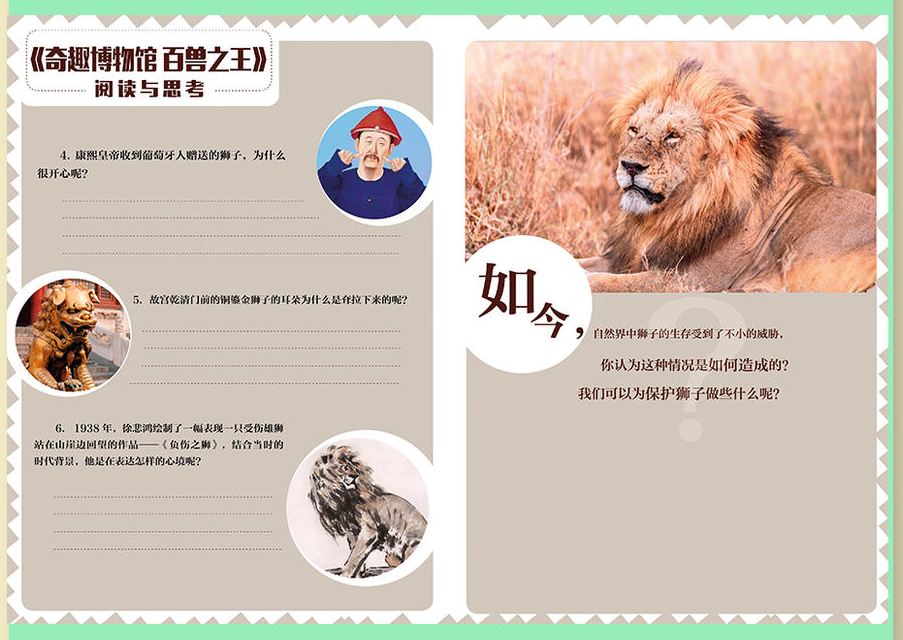 對於(yu) “熟悉話題”,比如以“獅子”這樣一個(ge) 孩子從(cong) 小就熟悉的話題為(wei) 切口,大家耳熟能詳的的達芬奇、恐龍骨架,我們(men) 要做有一定深度的多角度詮釋,讓孩子們(men) 的閱讀脫離泛泛的快餐旅遊式介紹,觸及到現象背後的文化內(nei) 核。