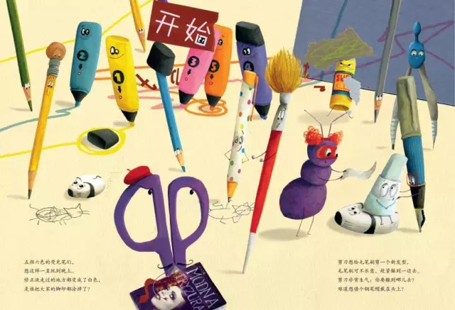 《文具大狂歡》是一本引領孩子探究、認知文具的圖書(shu) ,書(shu) 中的彩色鉛筆、圓珠筆、直尺、膠棒、等文具們(men) 就像一個(ge) 個(ge) 調皮的孩子,趁主人不在家,偷偷跑出文具盒,盡情地玩耍、打鬧,他們(men) 玩得很開心、很盡興(xing) ,但是卻將家裏攪翻了天,弄得一團糟……本書(shu) 的文字生動幽默,畫風活潑有趣。