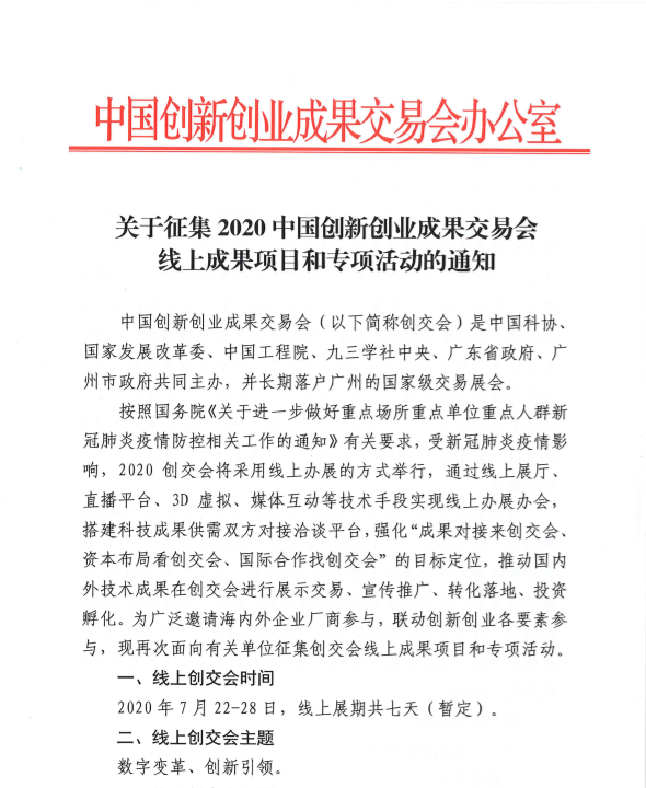 附件一:《關於征集2020中國創新創業成果交易會線上成果項目和專項活動的通知》