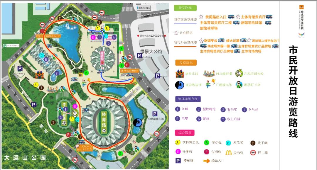 遊覽路線:黃閣路大運石→體(ti) 育館主館貴賓廳正門→主館貴賓廳二樓→副館羽毛球館→副館平台→繞大運湖→遊泳館二樓平台正門→繞主場外圍一圈→從(cong) 體(ti) 育館P2停車場入口進入→主體(ti) 育場貴賓廳品牌牆→主體(ti) 育場內(nei) 場→大運中心體(ti) 育場D口結束