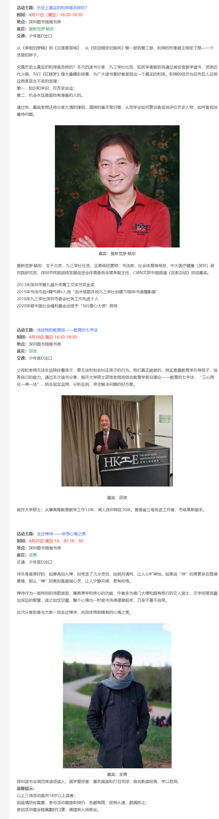 ”深讀讀書(shu) 沙龍“是深圳圖書(shu) 館聯合深圳讀書(shu) 會(hui) 舉(ju) 辦的一個(ge) 線下讀書(shu) 沙龍。每周日下午16:30–18:30,分享以國學、史學、文學、哲學為(wei) 主題的讀書(shu) 分享。既踐行深圳讀書(shu) 會(hui) 以為(wei) 每個(ge) 閱讀者創造舞台的使命宗旨,同時倡導閱讀空間價(jia) 值交流,以閱讀為(wei) 載體(ti) ,營造自然溫馨的讀書(shu) 氛圍,激發每個(ge) 人的分享熱情,增強個(ge) 體(ti) 與(yu) 個(ge) 體(ti) 之間的鏈接。