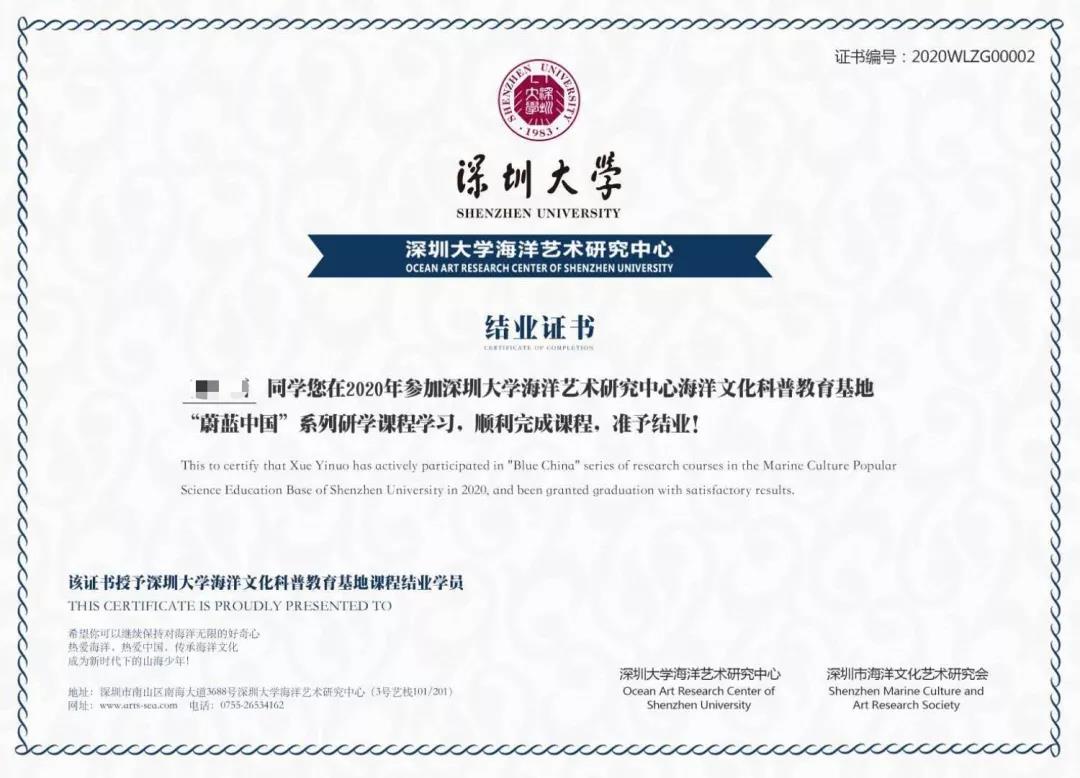 “蔚藍中國” 係列研學課程結業(ye) 證(深圳大學海洋藝術研究中心)