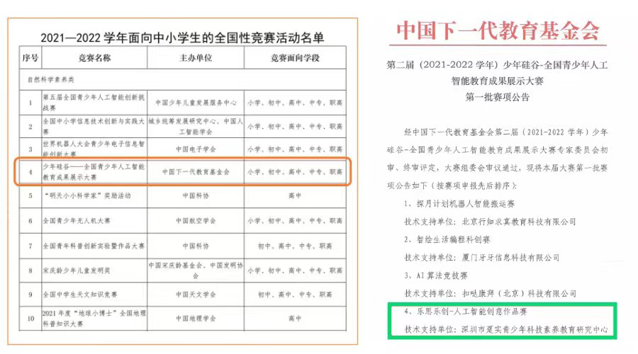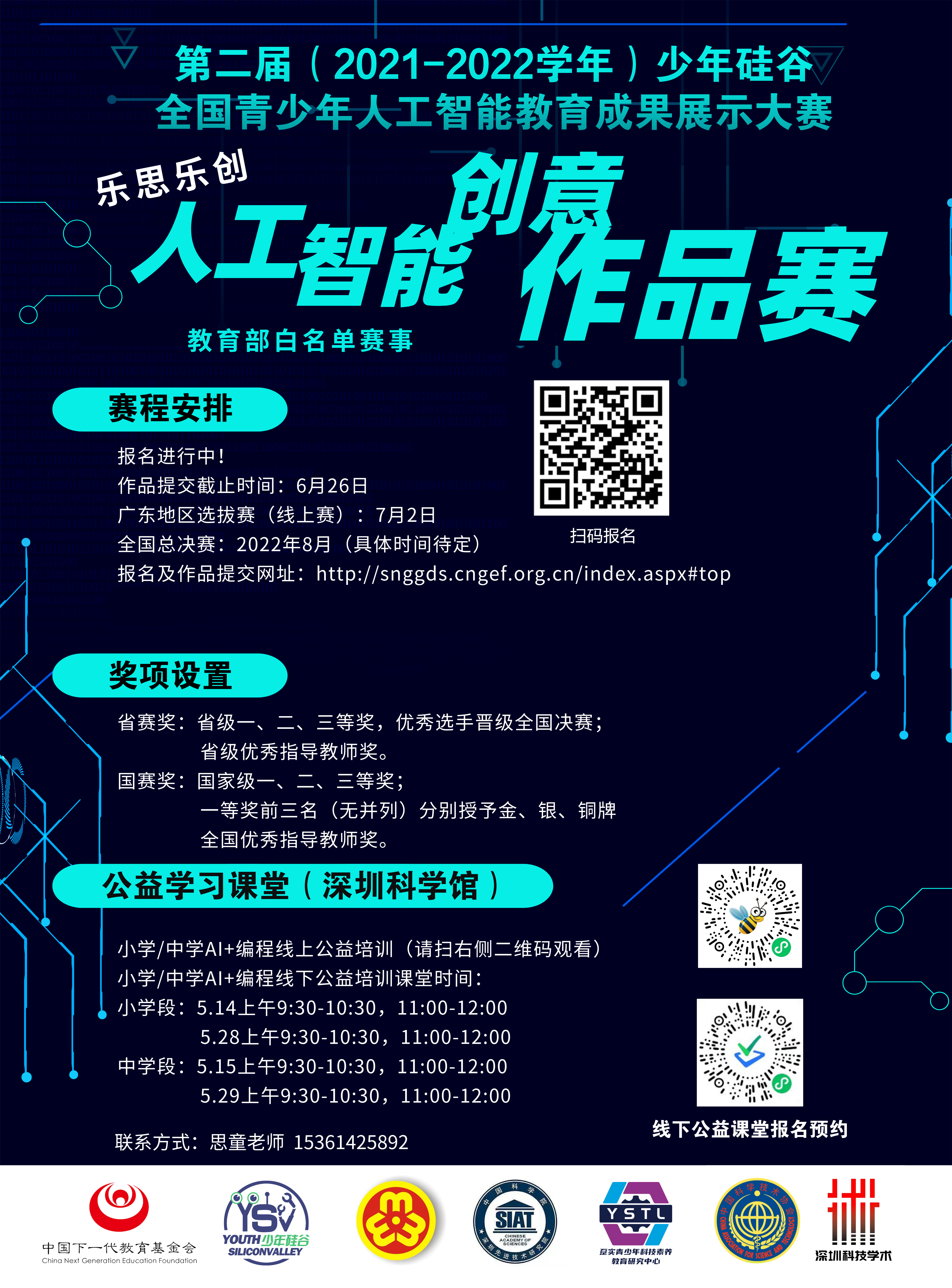 競賽含金量 競賽名稱:第二屆(2021-2022學年)少年矽穀全國青少年人工智能教育成果展示大賽 競賽官網:https://ystlerc.com/(預報名官網) 批準單位:中華人民共和國教育部 (教監管廳(2021)7號) 主辦單位:中國下一代教育基金會(hui) 賽項主辦:深圳市躉實青少年科技素養(yang) 教育研究中心 技術合作:中國科學院、中國航天工業(ye) 部、華為(wei) 鴻蒙 學術合作:中國科學技術大學、浙江大學、深圳大學 賽項主題:太空生活 競賽性質:國家教育部白名單賽事 大賽目標: 以“科技強國·未來有我”為(wei) 主題,以“堅持立德樹人,培養(yang) 具有家國情懷、崇尚科學的好少年”為(wei) 目標,彰 顯公益普惠風尚,助力深化教育改革、全麵實施素質教育。